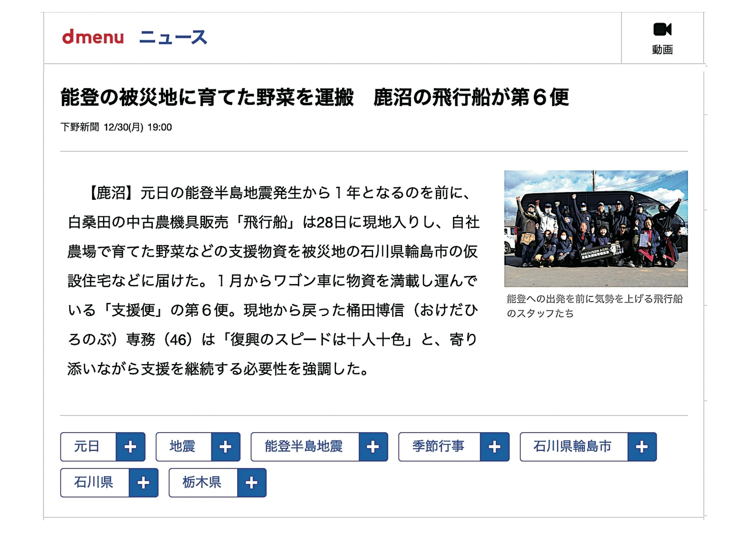 【鹿沼】元日の能登半島地震発生から1年となるのを前に、白桑田の中古農機具販売「飛行船」は28日に現地入りし、自社農場で育てた野菜などの支援物資を被災地の石川県輪島市の仮設住宅などに届けた。1月からワゴン車に物資を満載し運んでいる「支援便」の第6便。現地から戻った桶田博信(おけだひろのぶ)専務(46)は「復興のスピードは十人十色」と、寄り添いながら支援を継続する必要性を強調した。(前半一部のみ)
