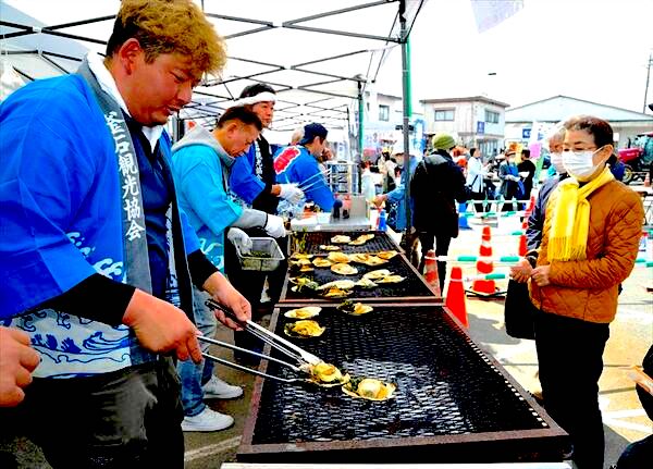 磯の香りが広がった会場では、能登産イワシの「塩焼き」、能登・釜石産カキの「蒸焼き」、釜石産ホタテと生ワカメを炭で焼いた「浜焼き」や、南三陸産生ワカメをふんだんに使用した「どんこ(大槌産)汁」などのブースに、午前10時の開始前からご来場いただいた方々が長い列をなし、沢山の海の幸を味わっていただきました。